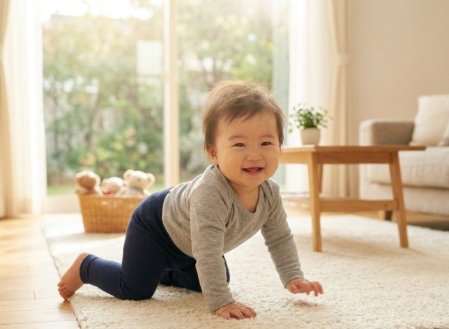 生後半年を過ぎ、寝返りやハイハイが活発になると、多くのママ・パパが検討し始めるのが上下セパレートのベビー服への移行です。